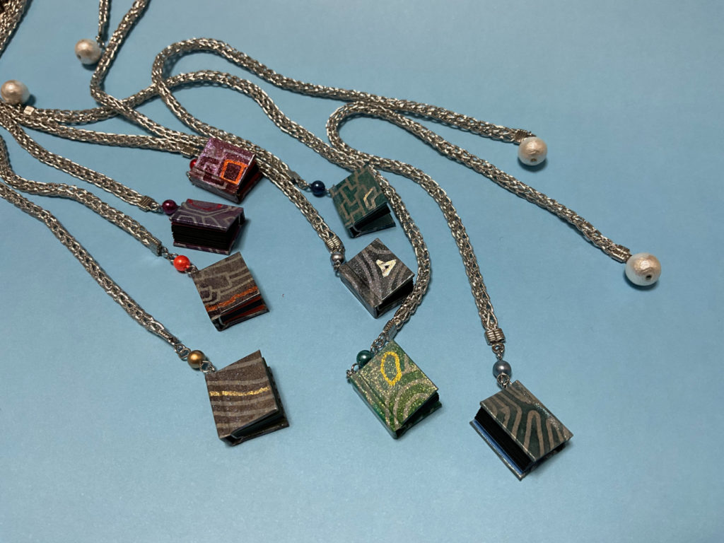 小さな豆本で作ったアクセサリー。ピアスやイヤリング、クリップ、ブックマーカーなどに加工しています。豆本のページは小さいけれどちゃんと開くように作ってあります。